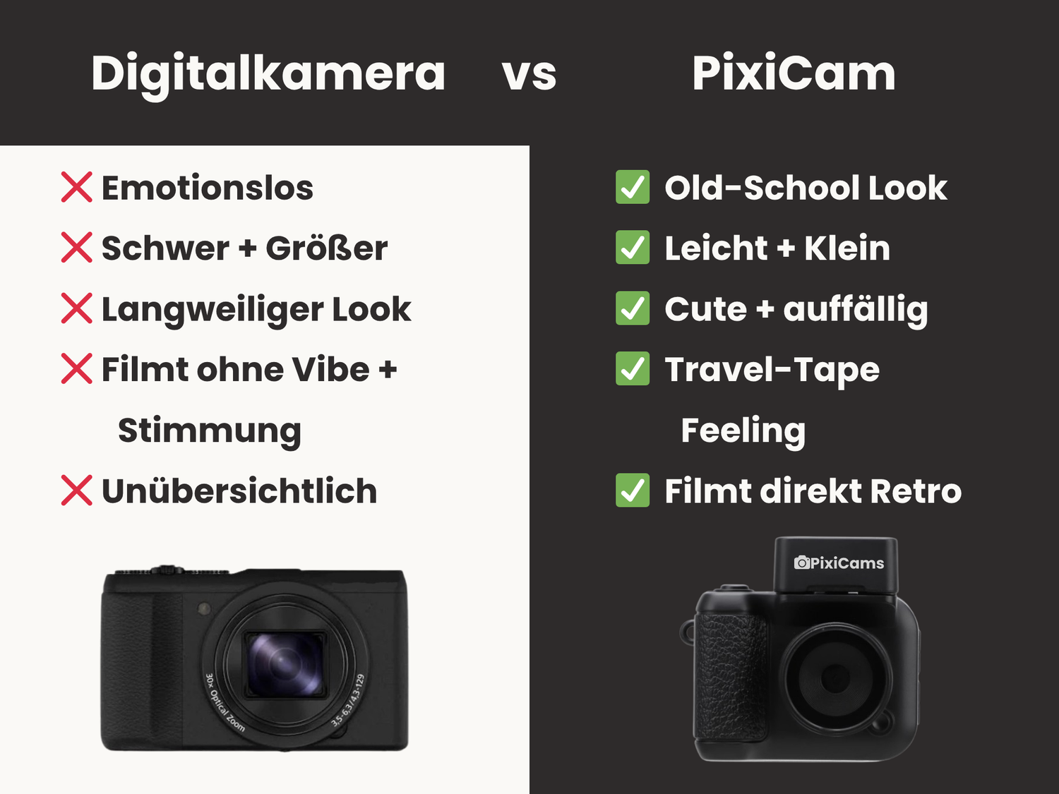 Die PixiCam ist deine Mini Retro Kamera für echte Vibes – Videos, Fotos, Filter & Flash in nur 5 cm. Klein, stylisch & ready für alles, was du liebst.