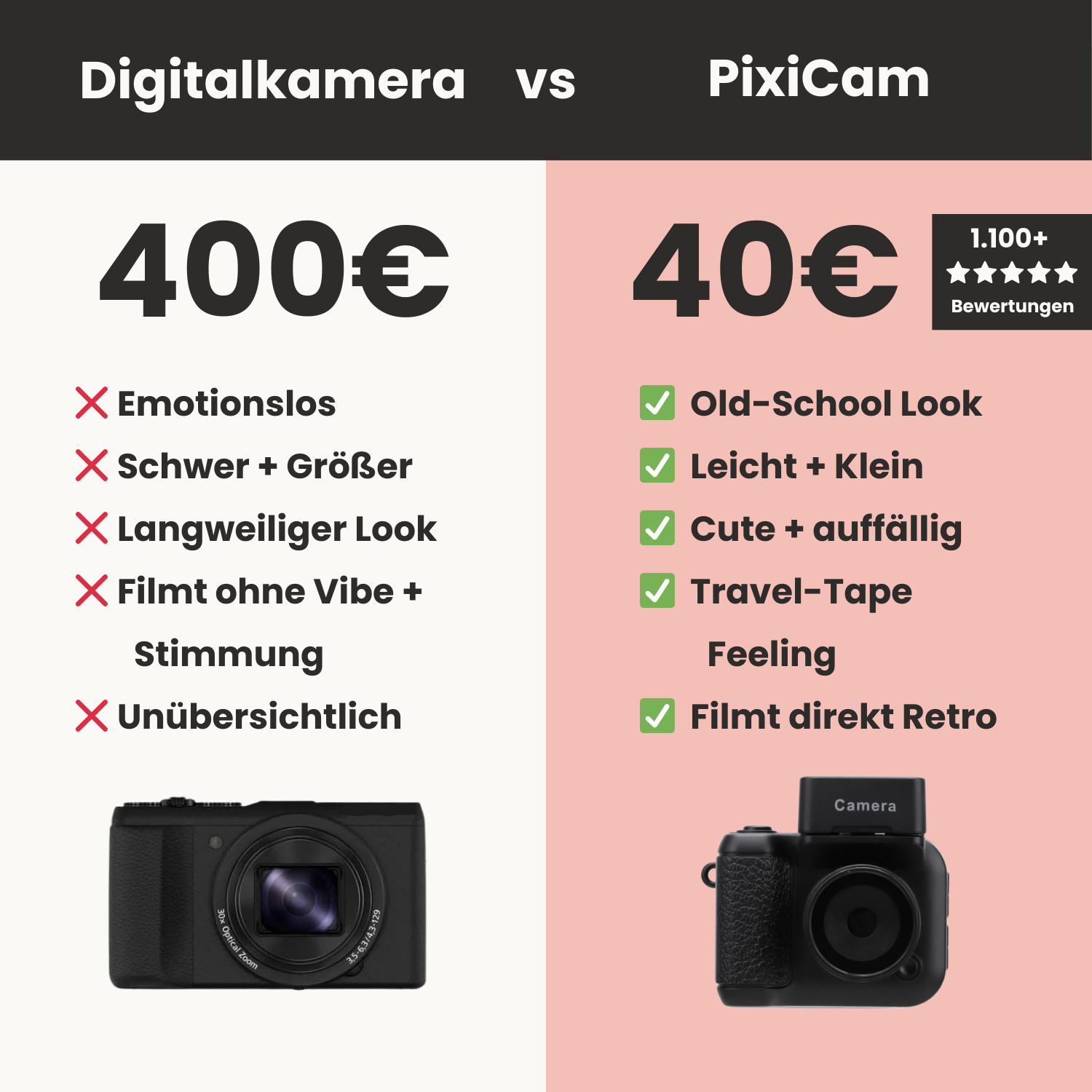 Ich liebe die PixiCam! Sie ist so klein, dass sie in jede Tasche passt, und die Retro-Filter sehen einfach mega aus. Perfekt für Abende mit Freundinnen oder kleine Trips.